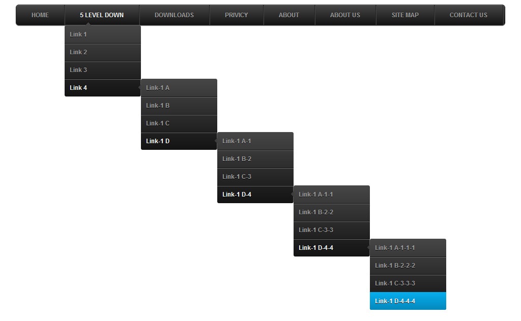 Наше меню будет сделано из одного родительского элемента под названием Главное меню и пяти подразделов. Изменяя адрес внутри атрибута href, вы можете связать каждый подраздел с разными страницами вашего сайта. Вы наверное заметили, что каждый элемент имеет разный класс — dropdown, mainmenubtn и dropdown-child. Классы необходимы для применения правил CSS.