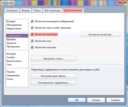 - Показать дополнительные настройки и выбрать Настройки содержимого.