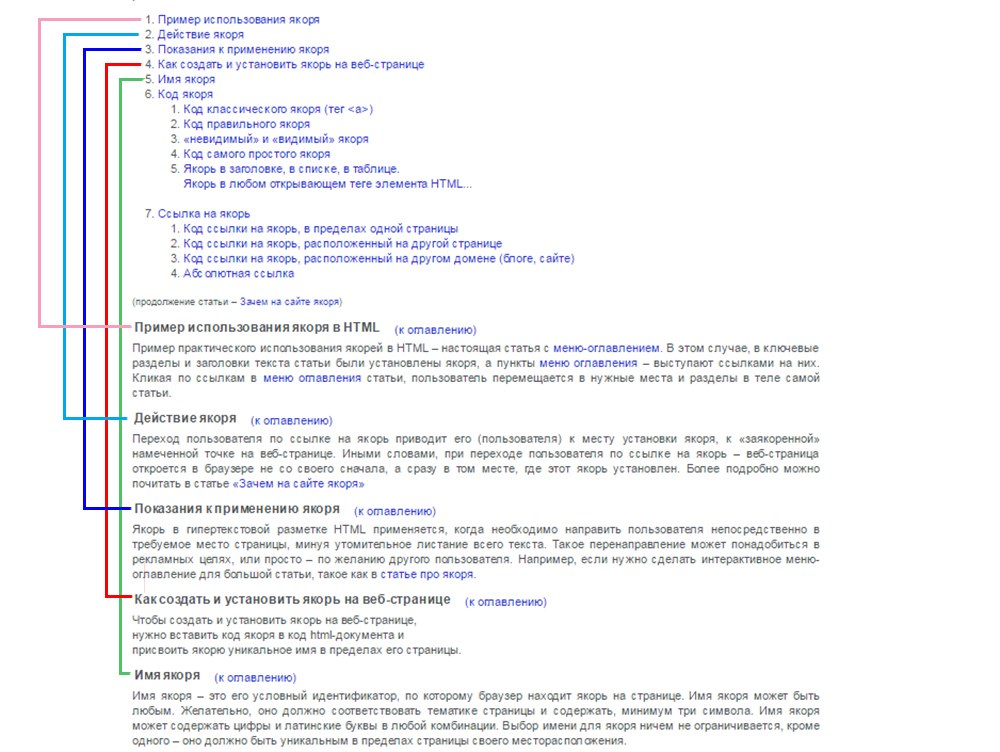 Потом рядом с подзаголовками я ставлю якоря, чтобы при клике на ссылку читатель переместился к нужному подзаголовку.