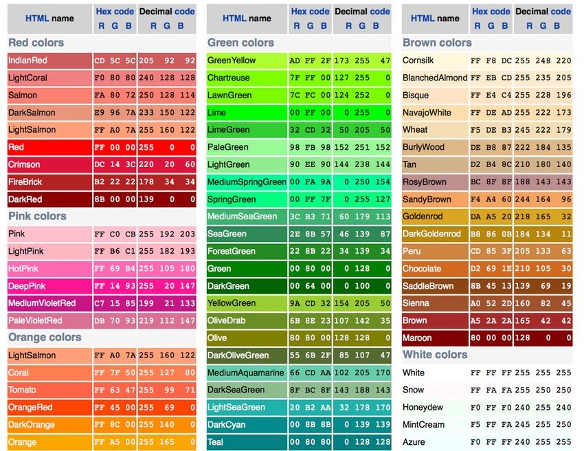 Следующая таблица содержит шестнадцатеричные цветовые коды RGB, используемые различными тегами HTML (язык гипертекстовой разметки) и атрибутами CSS (каскадная таблица стилей) для определения значений цвета.