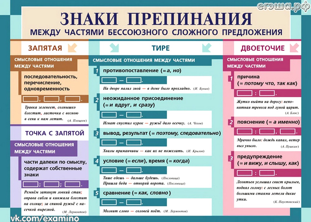 Двоеточие и тире в бессоюзном сложном предложении: таблица