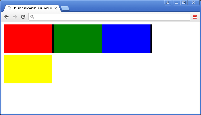 Для того, чтобы понять стоит ли нам использовать альтернативные способы вычисления ширины и высоты элементов, давайте рассмотрим пример, в котором создадим четыре блока одной ширины, при этом мы будем использовать процентные значения: