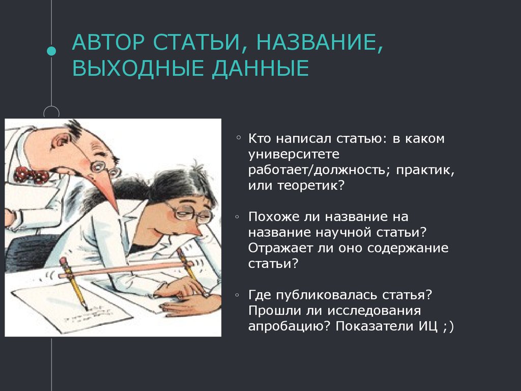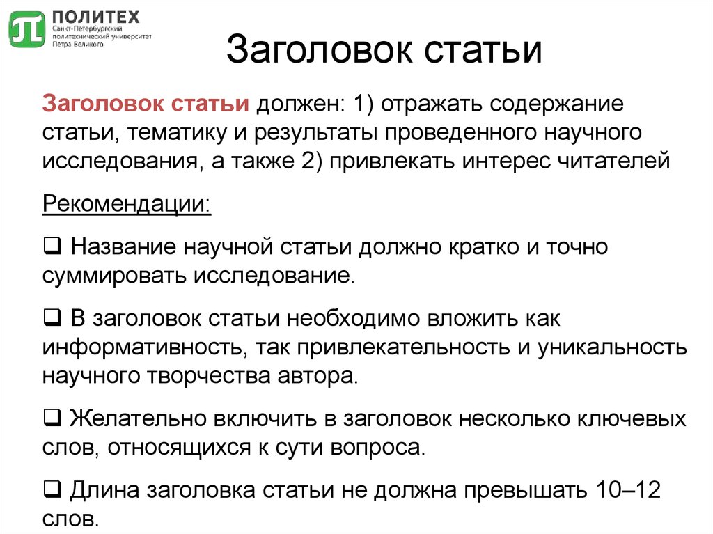 При этом название не должно вызывать вопроса «Разве никто не писал об этом раньше?» Задайте себе такой вопрос. Если ответ будет положительным, то в названии стоит конкретизировать новизну именно вашей статьи.