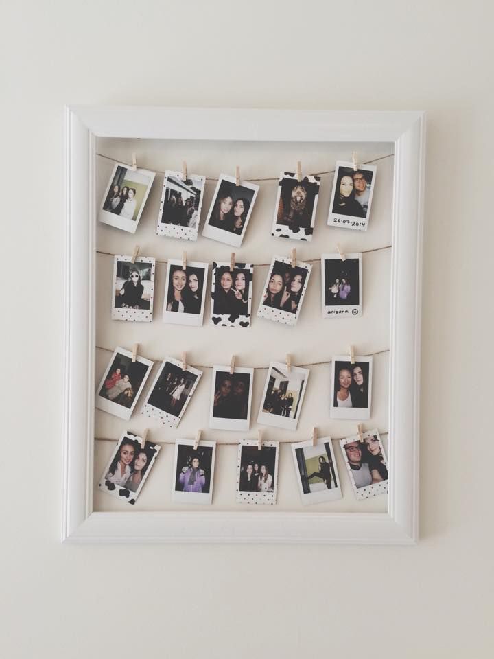 Нарежьте шнур на отрезки чуть длиннее ширины вашей рамки. Завяжите на концах узелки, воткните в них по кнопке и прикрепите кнопки к рамке с внутренних сторон, как показано на фото. Останется повесить фото на зажимы.