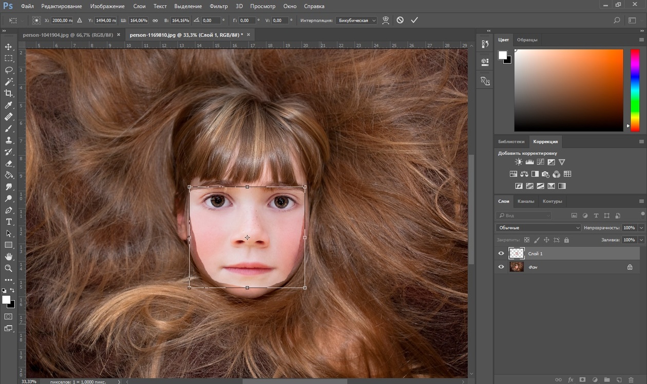 Комбинацией клавиш «Ctrl / Cmd + t» вызываем инструмент трансформации и, удерживая клавишу Shift (для сохранения пропорций), тянем за уголок сетки фото, кадрируя его до нужного размера. Затем отпускаем мышку и клавишу Shift (именно в такой последовательности) и, когда курсор изменится на полукруглую стрелочку, кликаем и вращаем фото до нужного нам выравнивания. Как только добиваемся нужного результат, нажимаем Enter.