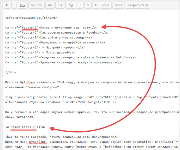 Перед каждым заголовком в вашей статье, вы должны добавить якорь, который имеет следующий вид.