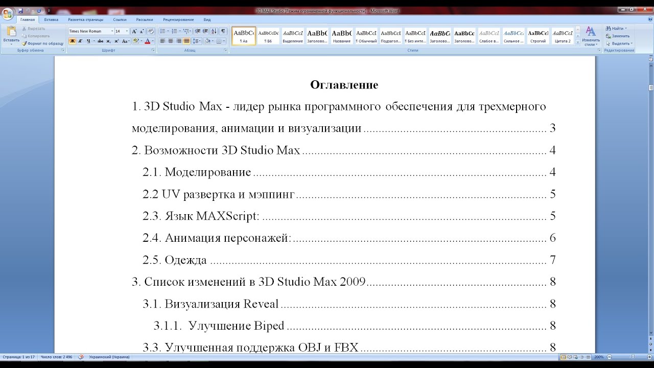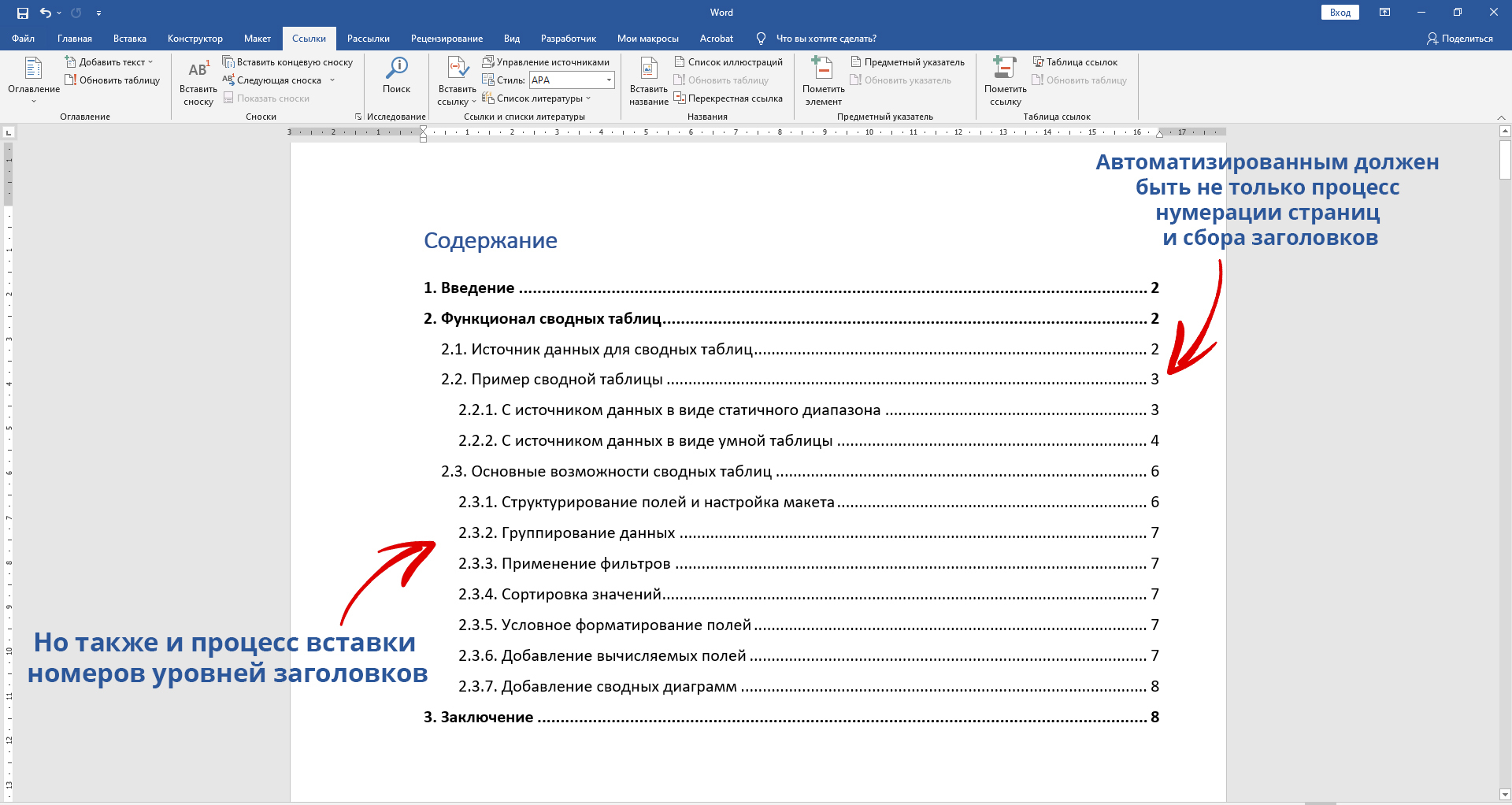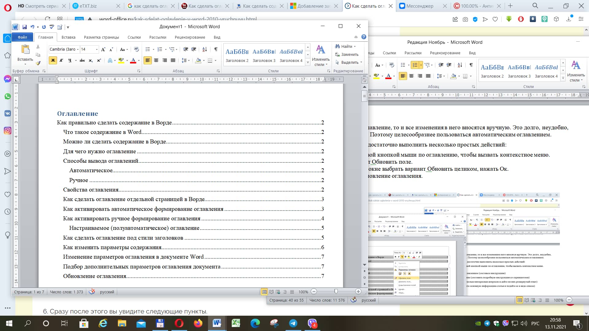 Оглавление помогает сразу видеть все эти заголовки, а значит и составные части вашего текста.