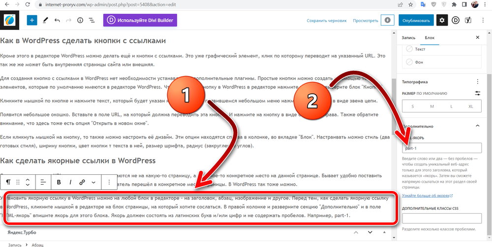 Это также относится к якорям на странице. Якоря используются для создания ссылок на определенные местоположения на веб-странице. Подробнее о вставке якорей.