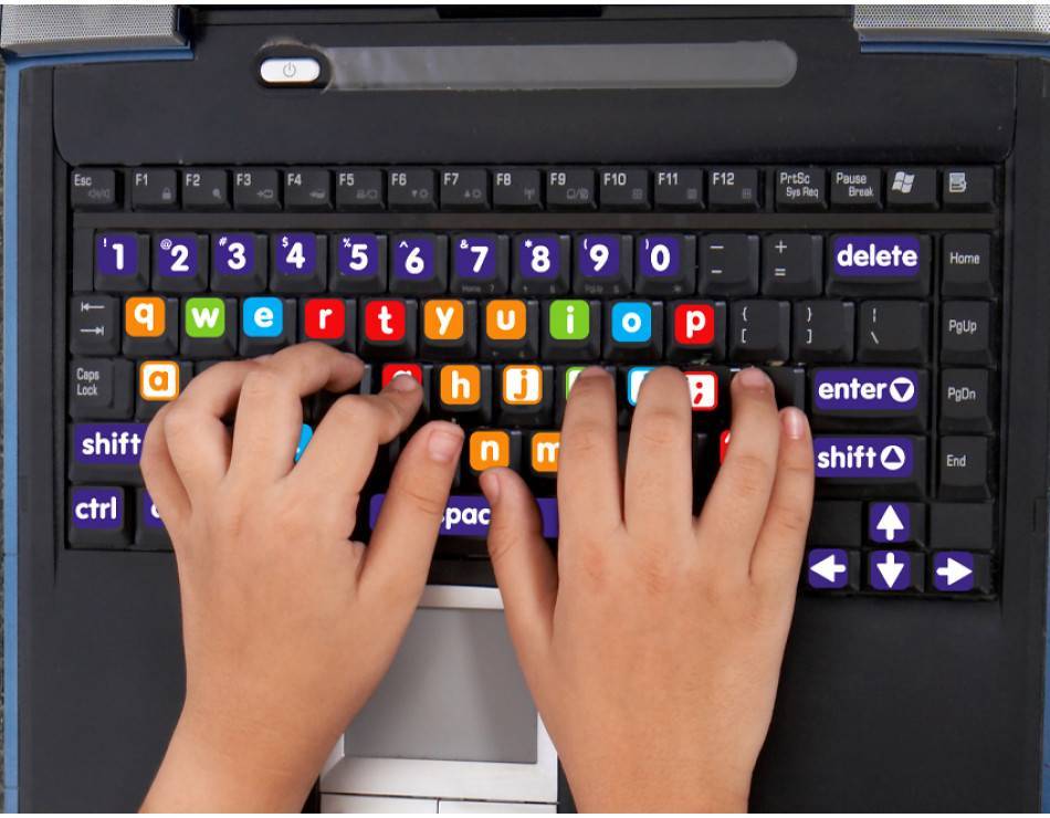 Для изучения слепой печати существуют специальные клавиатуры. Они разделены на зоны по цветам, чтобы пальцам было легче ориентироваться. На некоторых нет буквенных обозначений.
