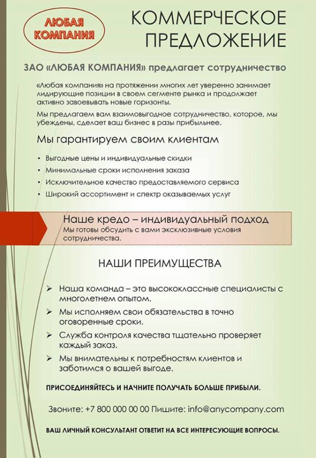 - перечисление выгод, которые получит клиент от сотрудничества. Помните: людям неинтересно, какие вы классные и сколько лет работаете на рынке. Им важна ценность купленного на свои честно заработанные деньги товара или услуги.