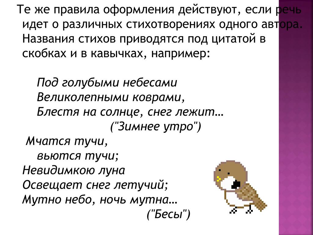 Важно помнить, как оформляются стихотворные цитаты. Если цитата представляет собой фрагмент стихотворения, то кавычки не ставятся. Стихотворные строчки записываются с новой строчки, а если дальше текст продолжается, то после цитаты ставится тире. Приведем пример.