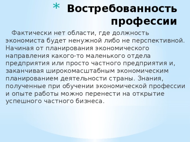 Экономист — профессия вне времени. Каждый специалист ценится на рынке труда, компании и организации нуждаются в грамотном работнике и предлагает рабочее место, вне зависимости от направления экономической деятельности.