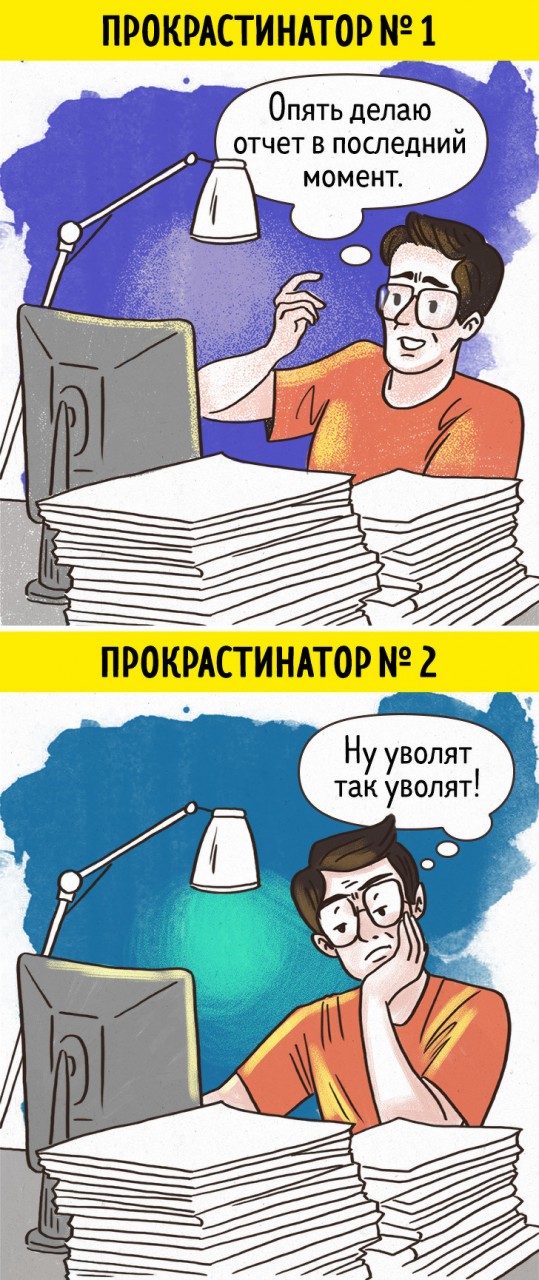 Активные прокрастинаторы целенаправленно откладывают задачу, потому что работа под давлением позволяет им «чувствовать вызов и мотивацию». Для них это в кайф. Им, в общем-то, и не хочется избавляться от такого способа жизни, пока хватает здоровья.