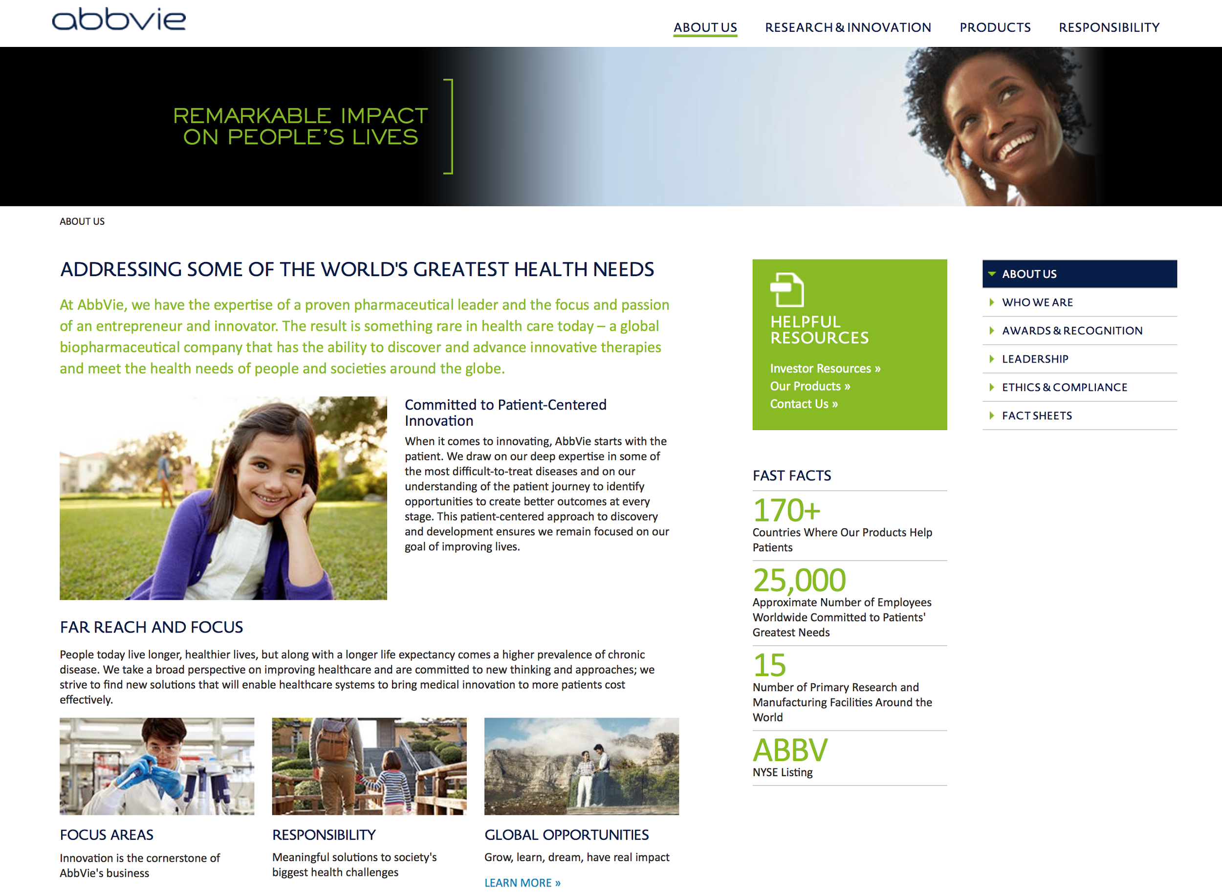 Фармацевтическая компания AbbVie: их страница «О нас» позволяет получить достаточно полное представление о компании, в частности, благодаря «быстрым фактам». Но хотя у страницы отличный потенциал, здесь есть ещё над чем работать: например, стоит заменить рыночные достижения на информацию, интересную обычным людям. Избегайте громких слов вроде «революционный»: в лучшем случае они вызовут у пользователей недоумение, в худшем — явное недоверие.