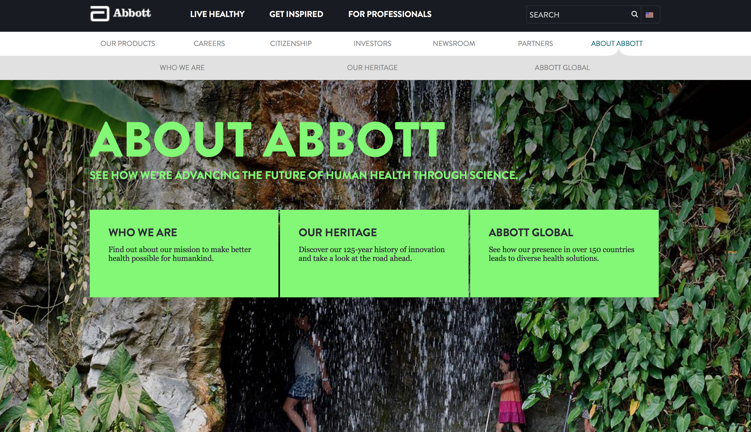Химико-фармацевтическая корпорация Abbott: эта страница «О нас» содержит очень мало полезной информации и вынуждает пользователей искать её в глубине сайта. Она словно стена, препятствующая знакомству с компанией. Лучше было бы начать диалог, предложив посетителям несколько интересных фактов.