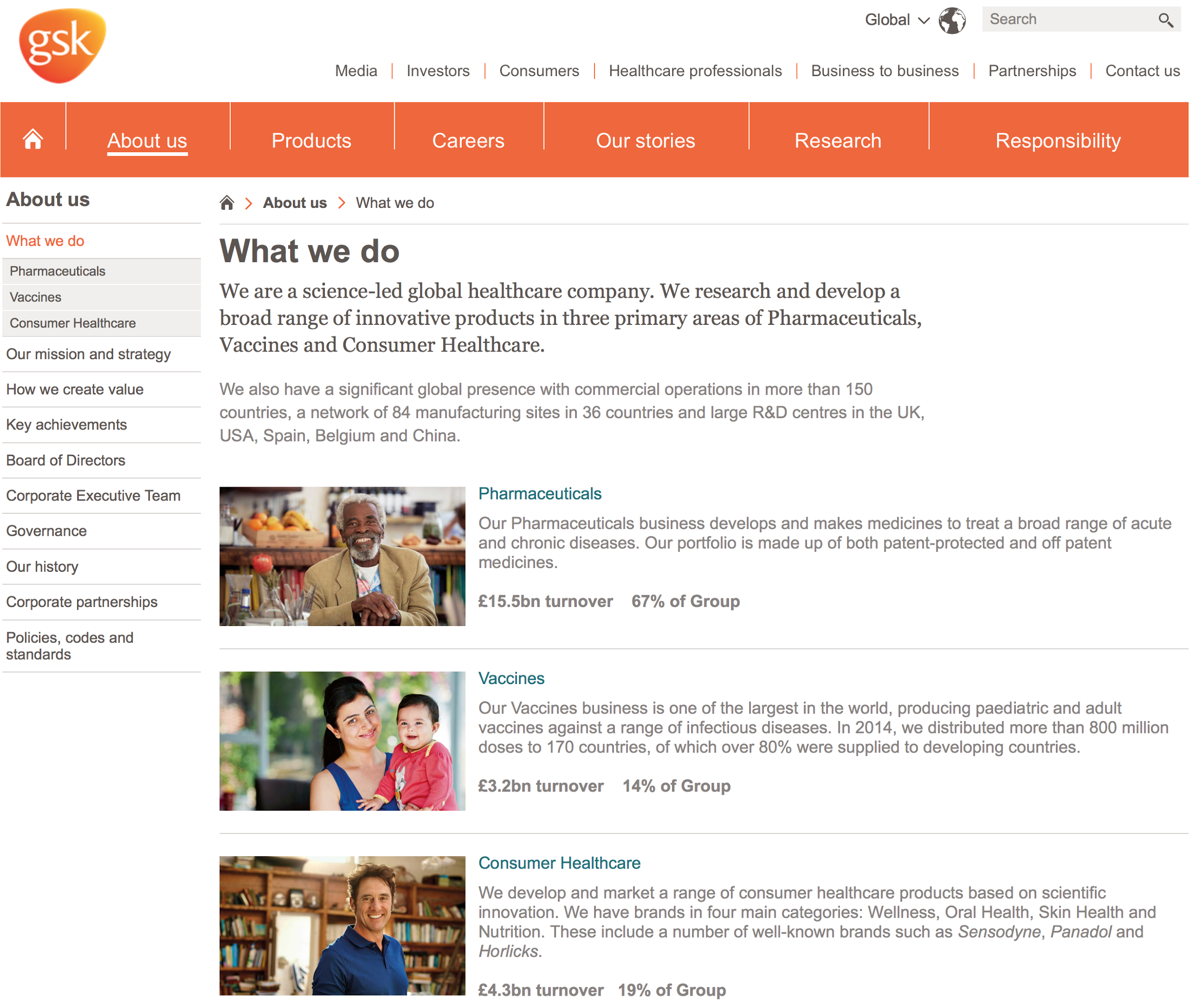Фармацевтическая корпорация GSK: в описании есть ответы на все ключевые вопросы, а оформление делает текст удобным для восприятия. Страница содержит факты, касающиеся каждого направления (например, лечебные препараты, вакцины). Благодаря хорошим текстам, подобным этому, пользователям не приходится тратить силы на выискивание интересующей их информации.