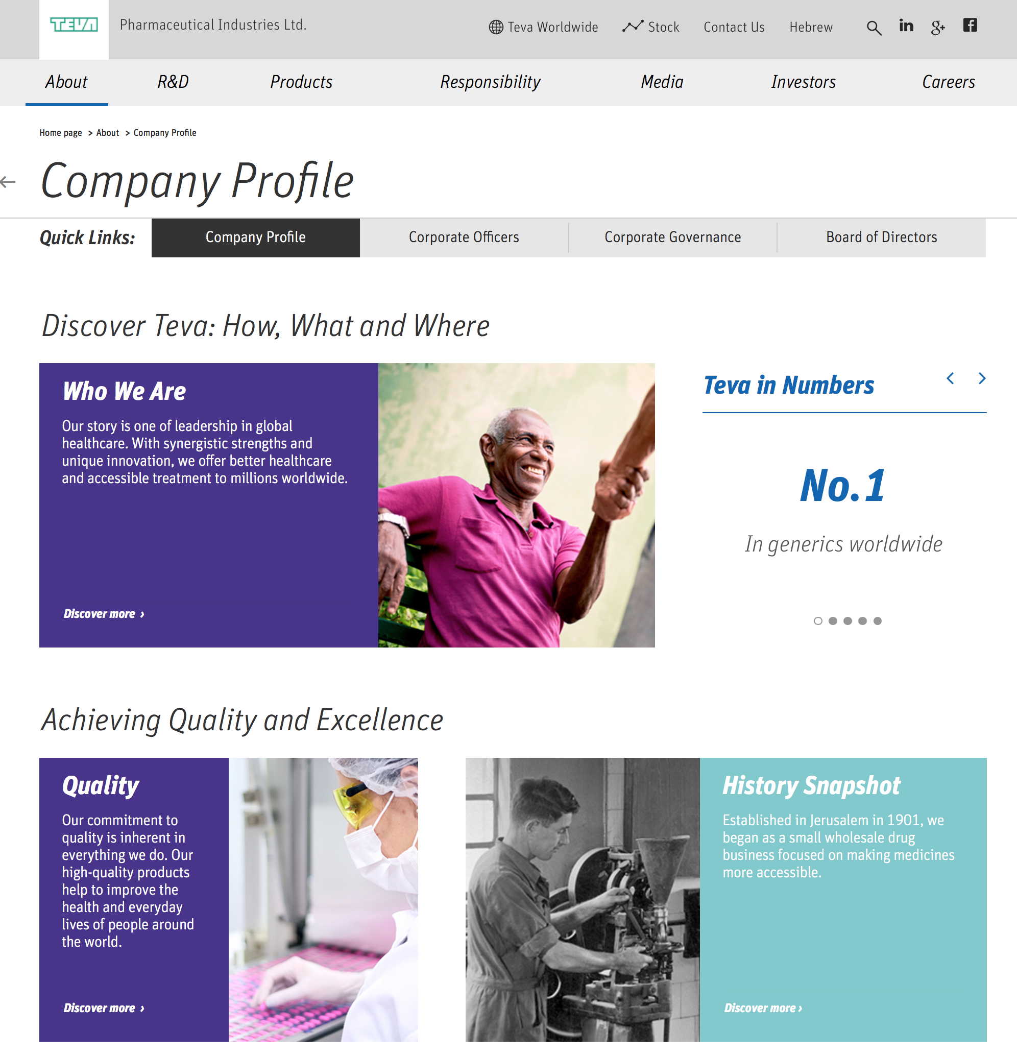 Фармацевтическая компания TevaPharm: страница «О компании» содержит самую общую информацию, ничего не говоря об уникальности предприятия. Возможно, что-то интересное скрывается за кнопкой «Узнать больше», но зачем же чинить такие препятствия на пути к данным?