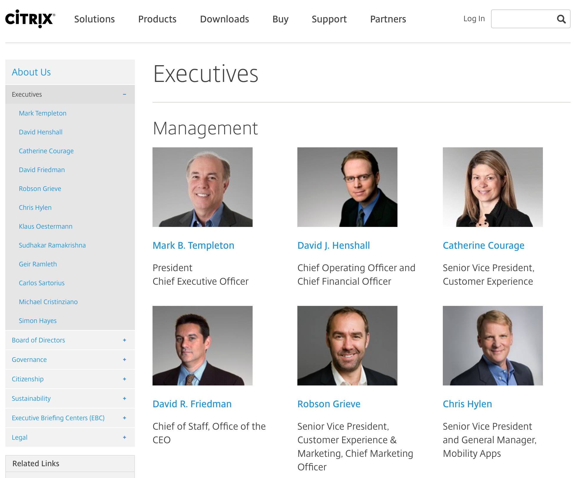Программное обеспечение Citrix: фотографии на странице «Руководство» демонстрируют в буквальном смысле слова лицо компании (а точнее, лица). Одного взгляда достаточно, чтобы получить представление о культуре организации и людях у её руля. Присутствие в административной команде широко известного UX-специалиста явно на пользу компании. (Если придираться по мелочам, то и на этой почти безупречной странице можно найти кое-какие огрехи. Следовало бы сократить интервал между именами и должностями для лучшего восприятия информации. Сейчас может показаться, что подпись «Chief Executive Officer» (Генеральный директор) относится к Дэвиду Фридману, а не Марку Темплтону.)