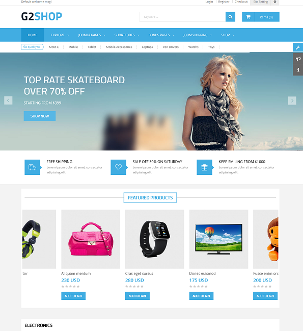 Прежде всего, главная страница хорошо спроектирована с потрясающим ползунком и каруселью для категории продуктов, поэтому она очень хорошо покажет все диапазоны ваших продуктов.